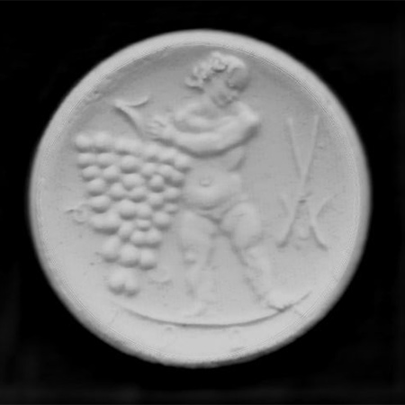 Rückseite: Auf einer gebogenen Halbkreislinie steht eine Putte mit Weintraube. Rechts die Kurschwerter. Unten steht halbkreisförmig «1921».